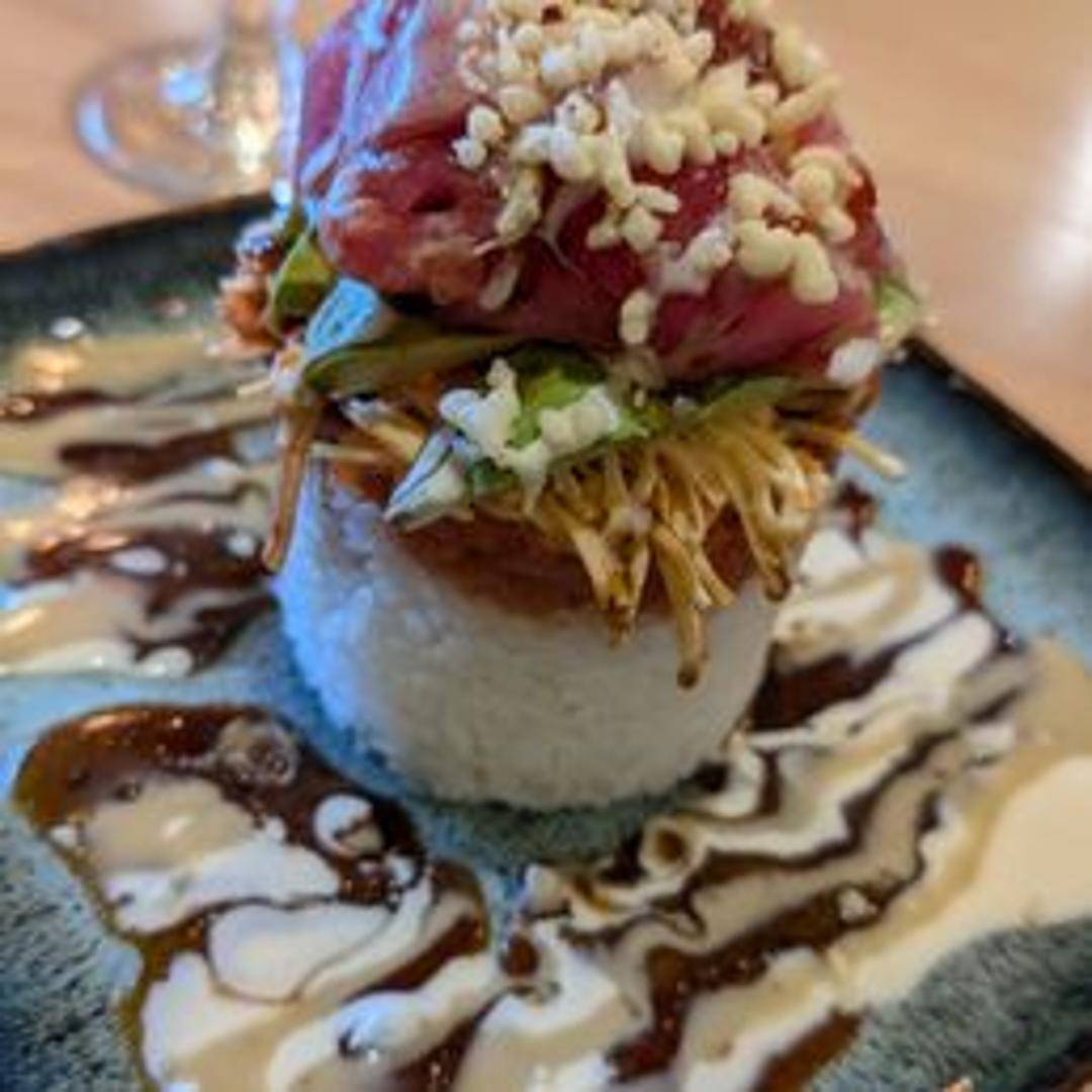 A layered tower of fresh ahi tuna, avocado, and other complementary ingredients. Typically features a flavorful sauce and crispy elements.