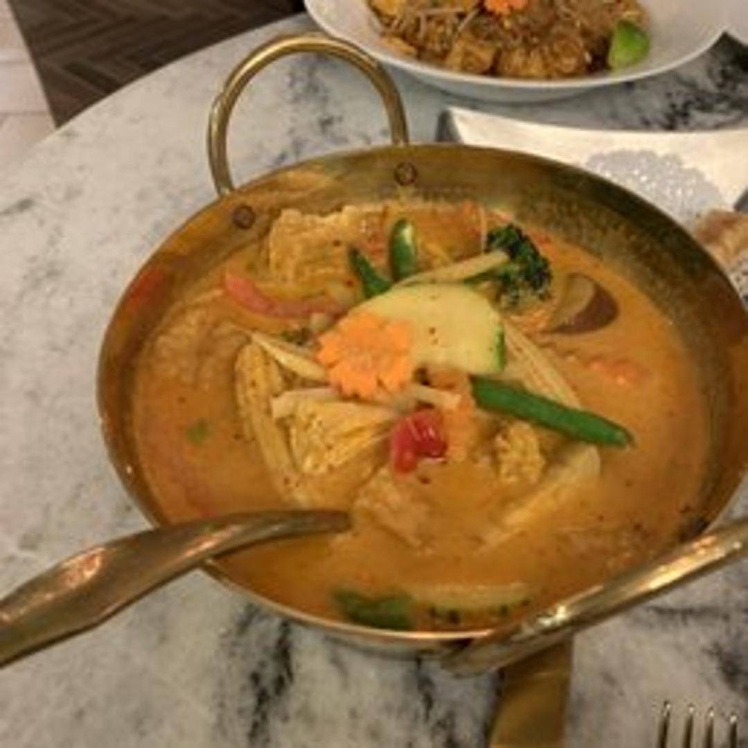 Experience the rich and aromatic depths of our Red Curry, a beloved Thai staple. This fragrant curry is prepared with a savory red chili paste cooked in creamy coconut milk, infused with bamboo shoots, bell peppers, and fragrant basil leaves. Its bold, complex flavors offer a perfect balance of sweet and spicy notes, creating a comforting and satisfying dish that pairs wonderfully with your choice of protein.