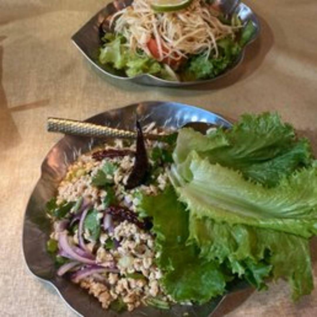 A vibrant and refreshing classic Thai salad, featuring crisp shredded green papaya muddled with fresh garlic, Thai chilies, juicy tomatoes, green beans, roasted peanuts, and a zesty dressing of lime juice, fish sauce, and palm sugar. This salad offers a delightful balance of sweet, sour, spicy, and savory flavors, providing a perfect light and invigorating start to your meal.