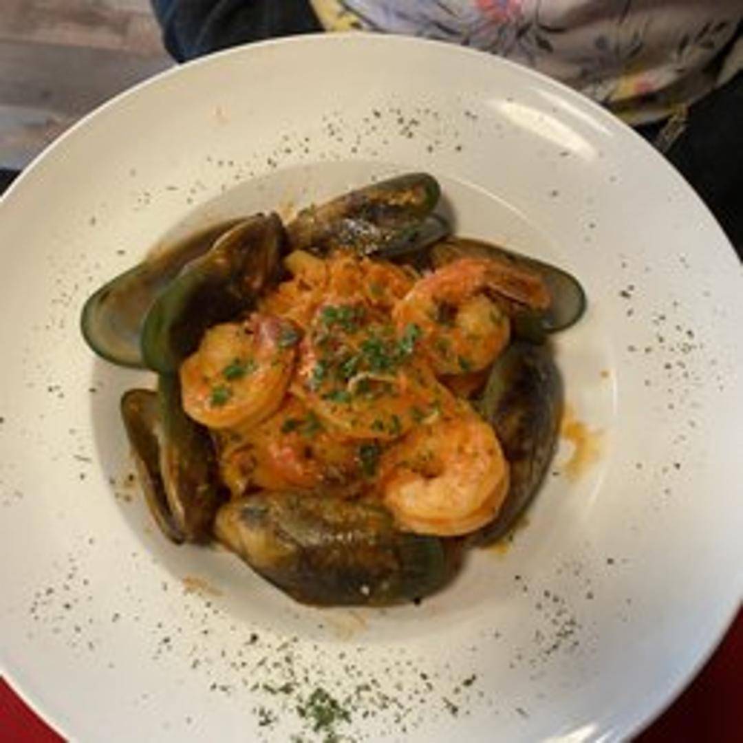 A spicy seafood pasta dish featuring shrimp, mussels, clams, and calamari simmered in a robust tomato sauce with chili flakes, served over your choice of pasta.