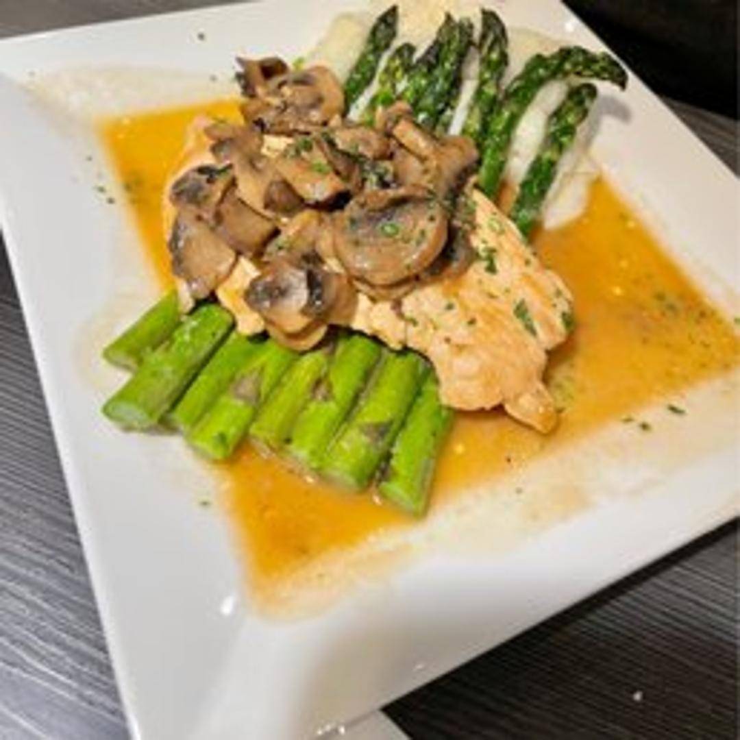 Pan-seared chicken breast in a rich Marsala wine sauce with mushrooms.