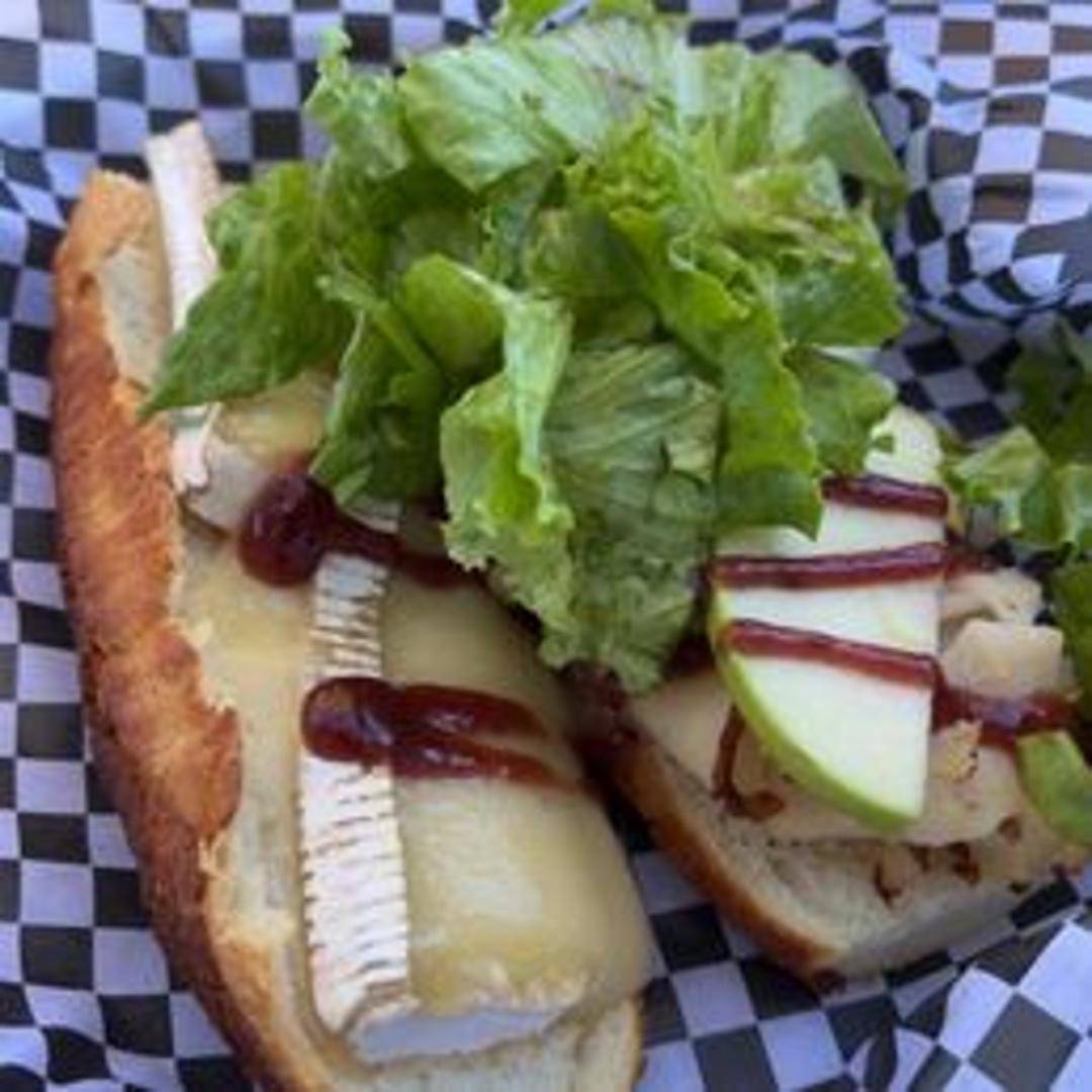 Savory sandwich featuring thinly sliced ham, melted brie cheese, crisp apple slices, and a touch of Dijon mustard, all served on a toasted baguette.