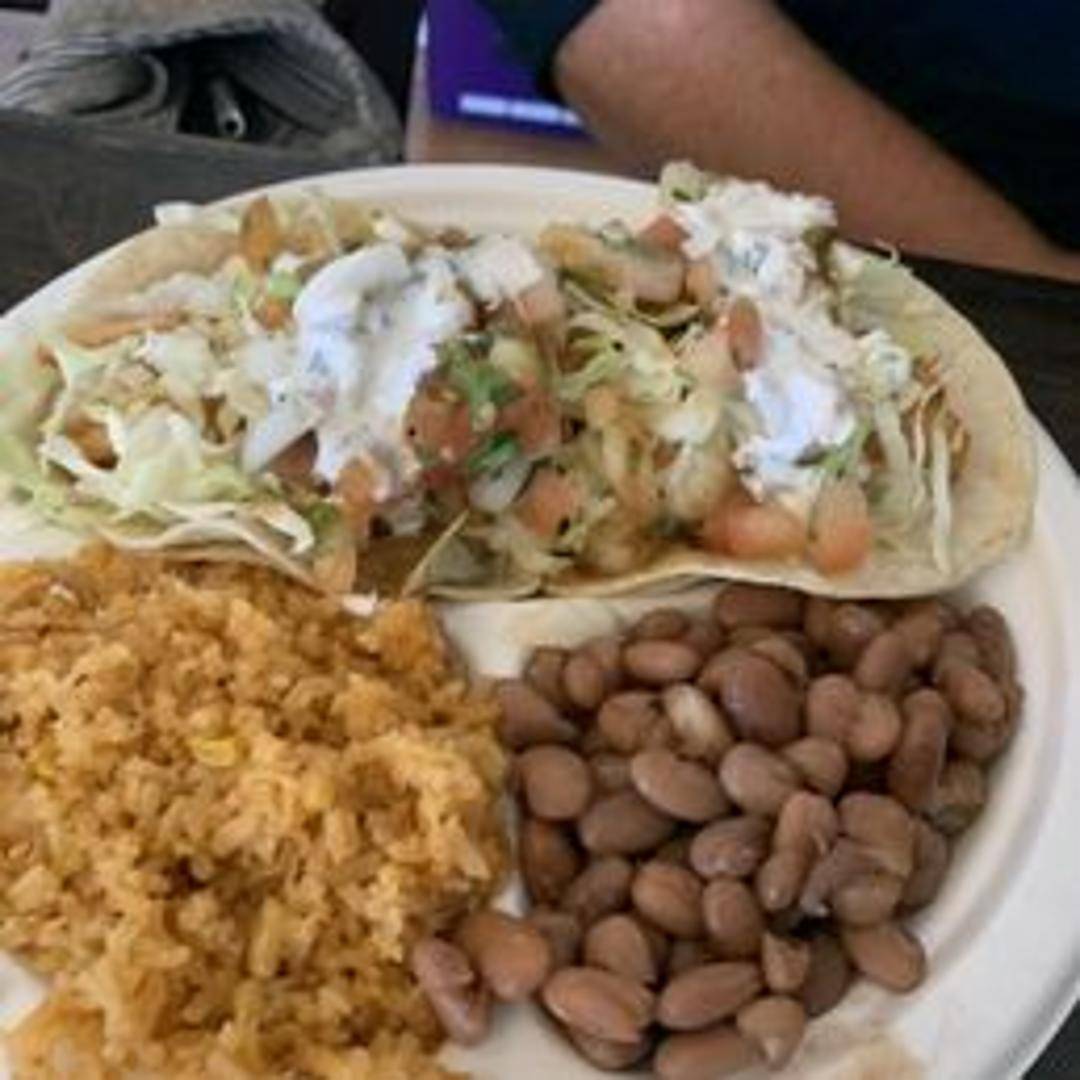 Crispy, batter-fried scallops served in a warm flour tortilla. Topped with shredded cabbage, pico de gallo, and a creamy sauce. Includes a side of rice and beans.