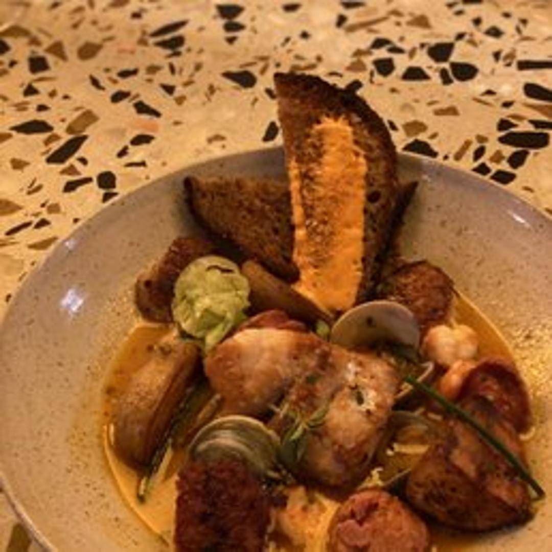 A rich and flavorful seafood stew featuring a variety of fresh, locally caught shellfish and finfish simmered in a tomato-based broth with herbs and spices. Served with grilled bread.