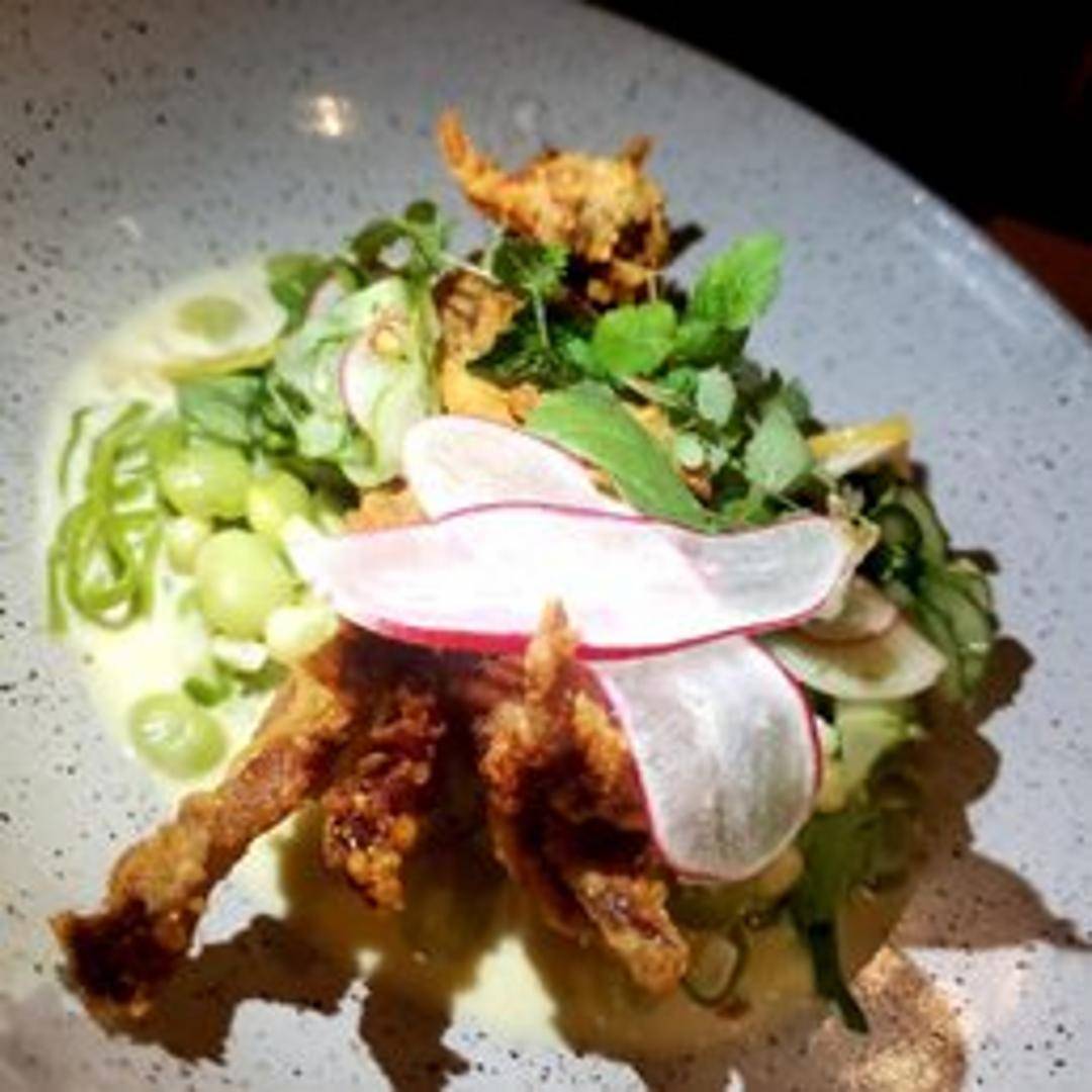 Crispy, whole soft shell crab, lightly battered and fried. Served with [mention accompaniments like sauce, slaw, or side dish].
