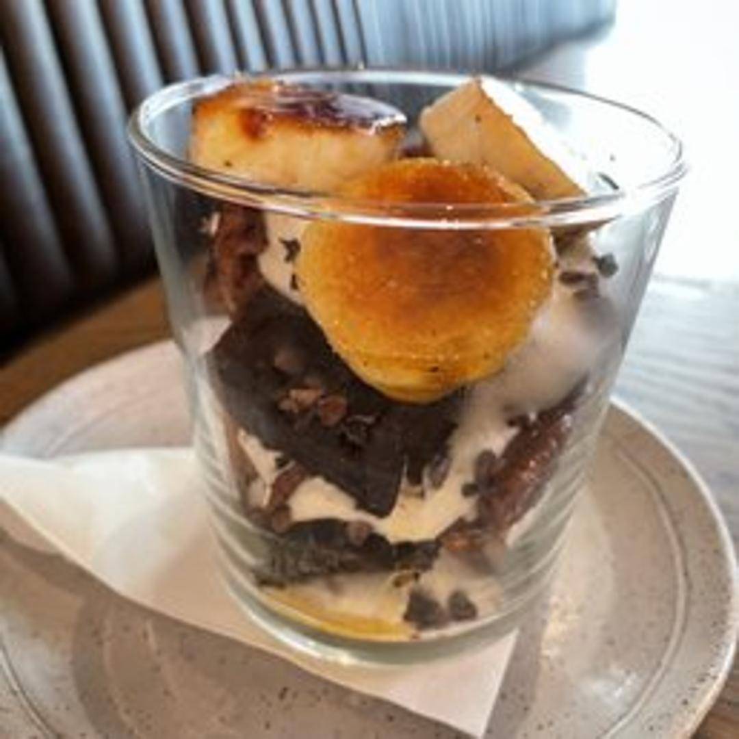 Layers of rich, fudgy brownie pieces, creamy custard or mousse, and whipped cream, served warm. May include additional toppings like chocolate sauce, caramel, fresh berries, or chopped nuts.