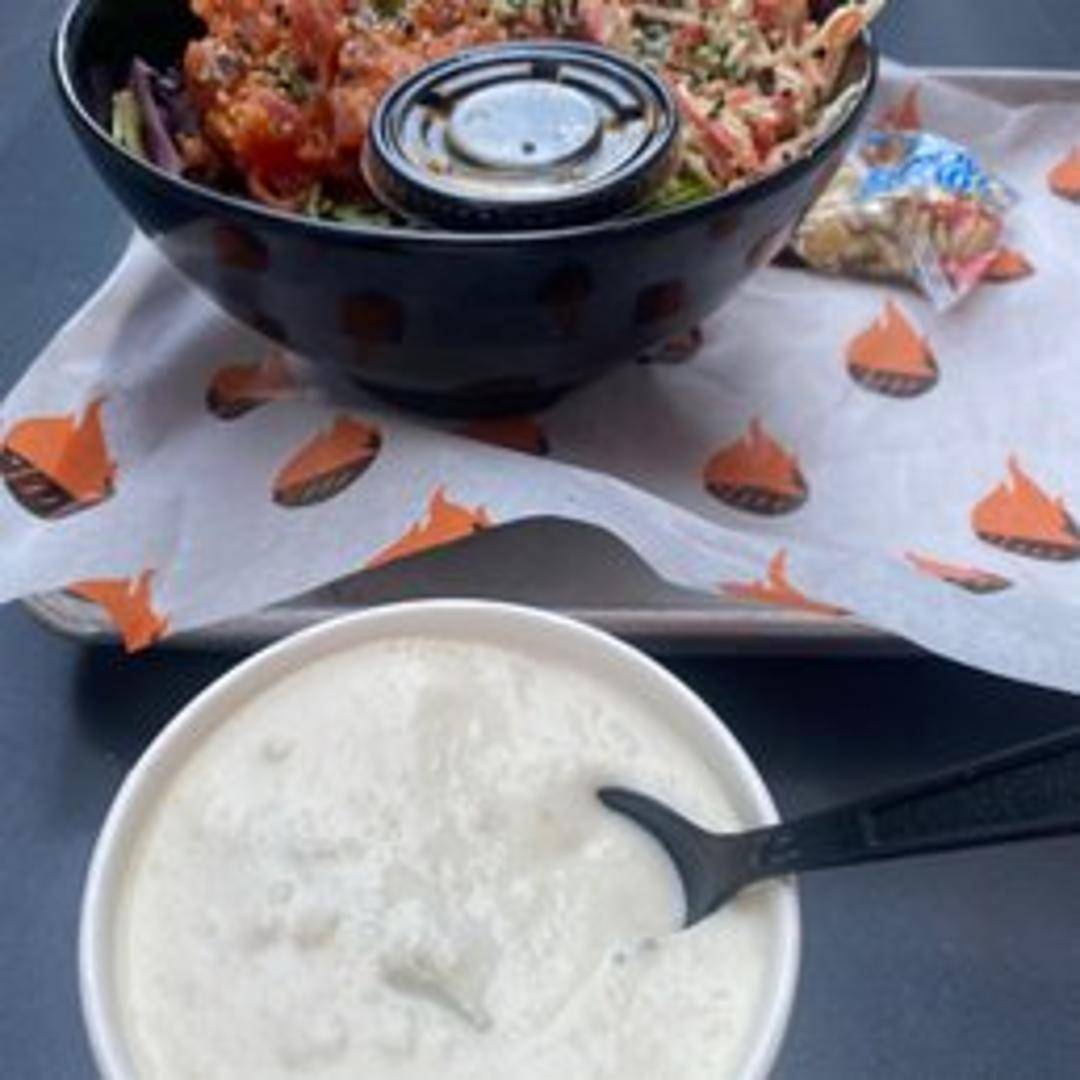 Indulge in a warm and comforting bowl of our New England-style Clam Chowder. This rich and creamy soup is brimming with tender chopped clams, diced potatoes, and savory bacon, all blended into a velvety broth. Garnished with fresh parsley, it's the perfect hearty starter or light meal.