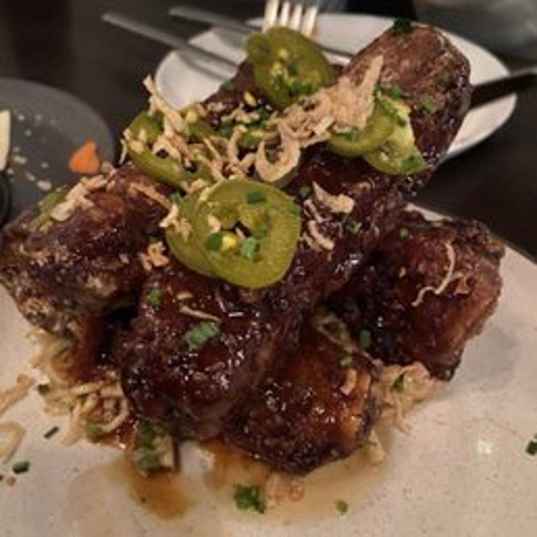 Perfectly cooked pork ribs, rendered to a crispy exterior while maintaining a succulent interior. Glazed with a flavorful sauce, offering a balance of sweetness, spice, and savory richness.
