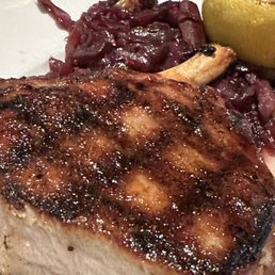 A flavorful and juicy pork chop seasoned with a savory dry rub and grilled over an open wood fire, creating a subtly smoky and perfectly seared crust. Served with accompaniments complementing its robust flavor.