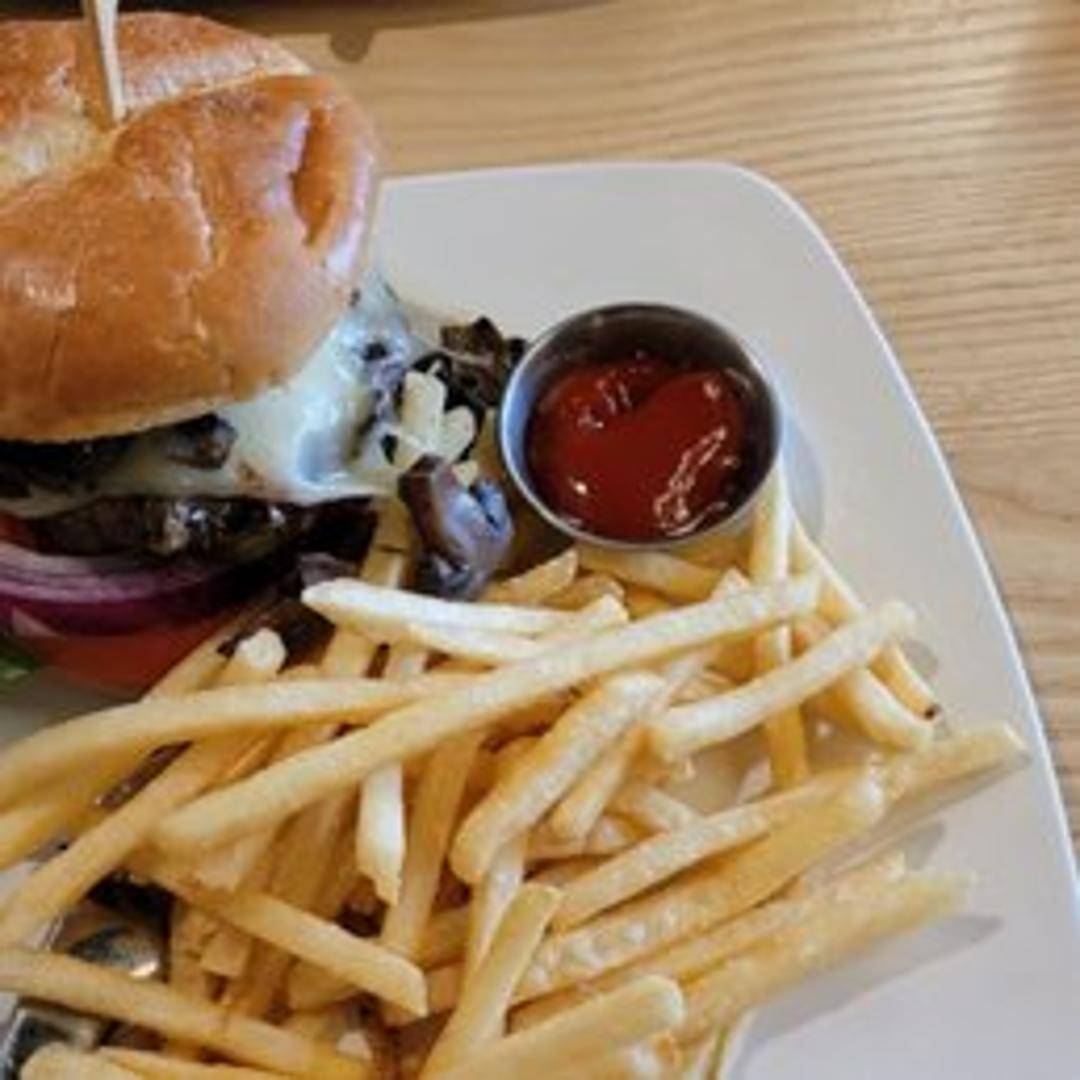 A classic burger featuring a juicy beef patty, melted cheese, lettuce, tomato, onion, and pickles, served on a toasted bun. Choice of side.