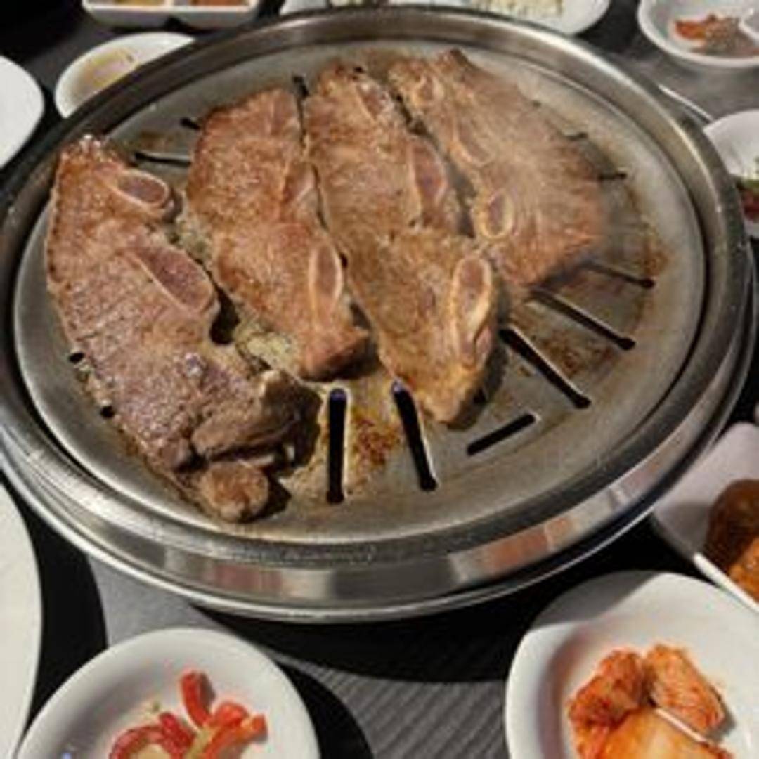Marinated Korean BBQ short ribs, often referred to as Kalbi. These ribs are cut across the bone, creating thin, flavorful pieces that are perfect for grilling. The marinade is typically a blend of soy sauce, garlic, sugar, sesame oil, and other spices, resulting in a sweet, savory, and deeply satisfying dish.