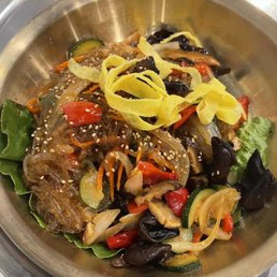 A colorful and flavorful dish featuring stir-fried glass noodles with a variety of vegetables such as carrots, onions, spinach, and mushrooms, all tossed in a savory soy sauce-based sauce and sesame oil. May contain thinly sliced beef.