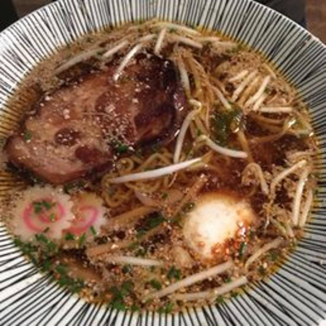 Classic ramen featuring a rich soy sauce-based broth, wheat noodles, tender chashu pork, a soft-boiled egg, bamboo shoots, nori seaweed, and green onions.