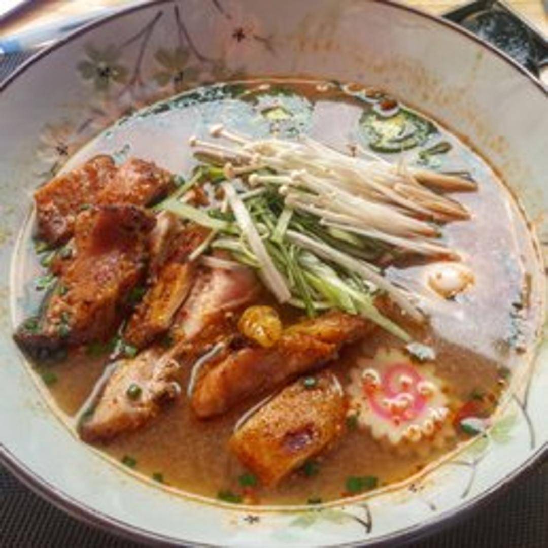 Ramen featuring tender chicken in a fiery, spicy broth. Garnished with chili oil, scallions, and other flavorful ingredients for a kick.