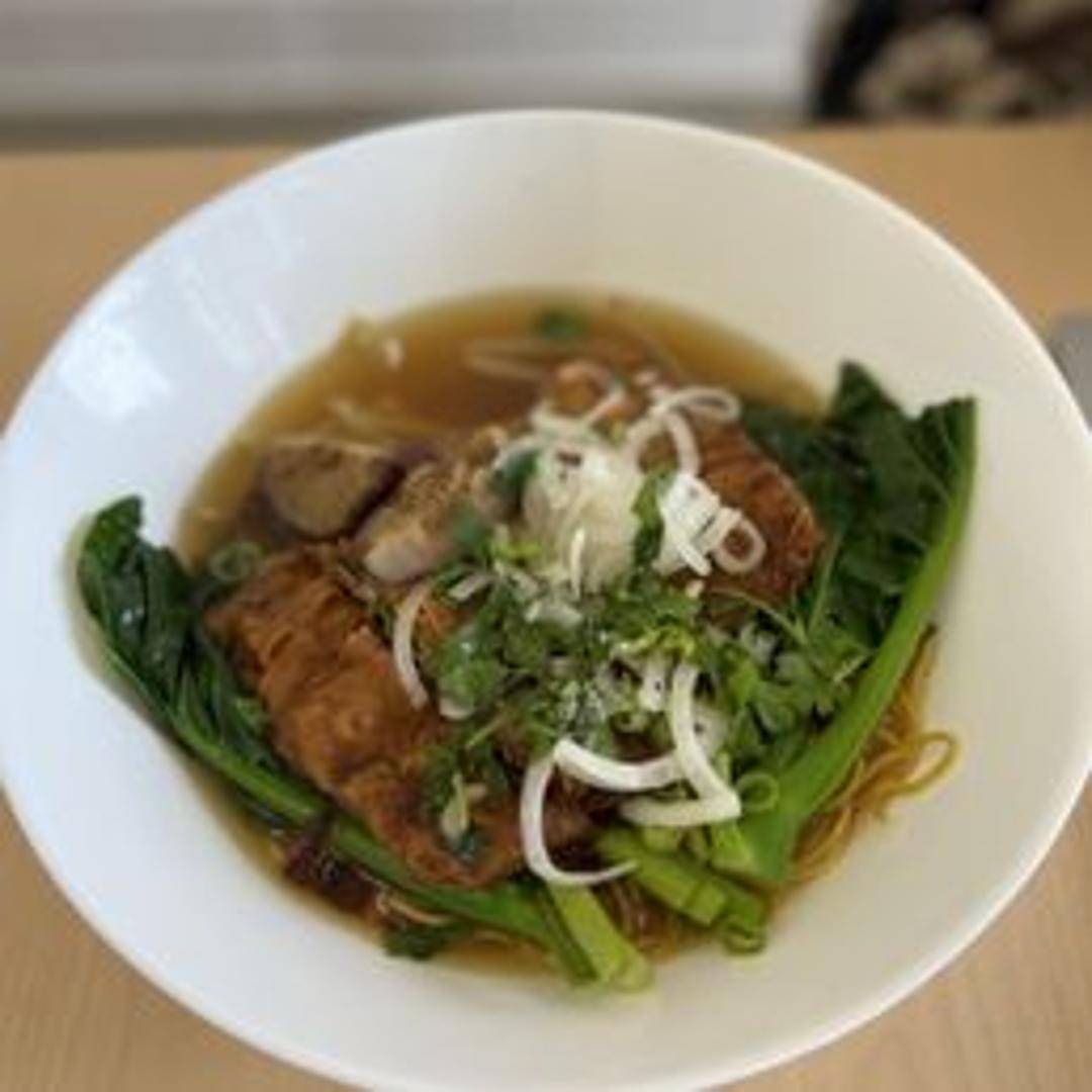 Tender, slow-cooked duck served atop a bed of perfectly cooked noodles. The dish features a savory and rich sauce, possibly incorporating star anise, soy sauce, and other traditional Chinese spices for depth of flavor. Garnished with fresh scallions and possibly other herbs for a fragrant and visually appealing presentation.
