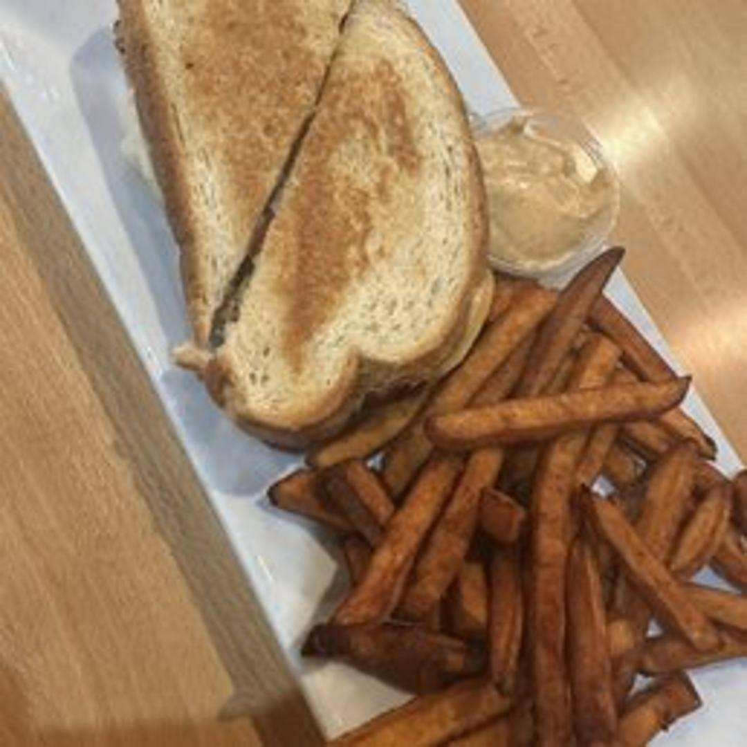 Marinated and grilled tempeh, Swiss cheese, sauerkraut, and Russian dressing on grilled rye bread. Served with a pickle spear.