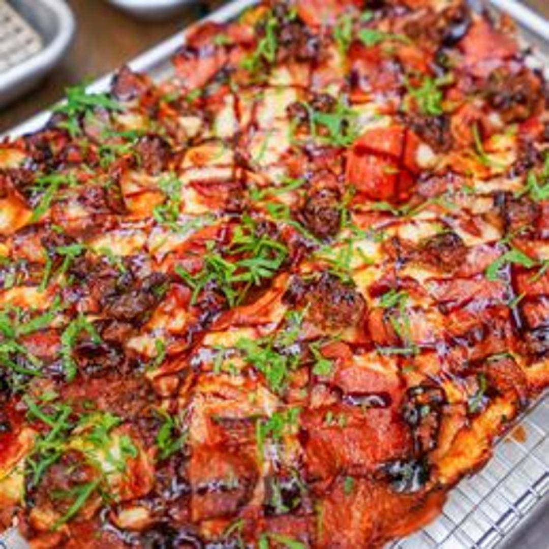 A pizza loaded with a variety of meat toppings. Typically includes pepperoni, sausage, bacon, and ham, all layered on a bed of cheese and tomato sauce for a hearty and satisfying meal.