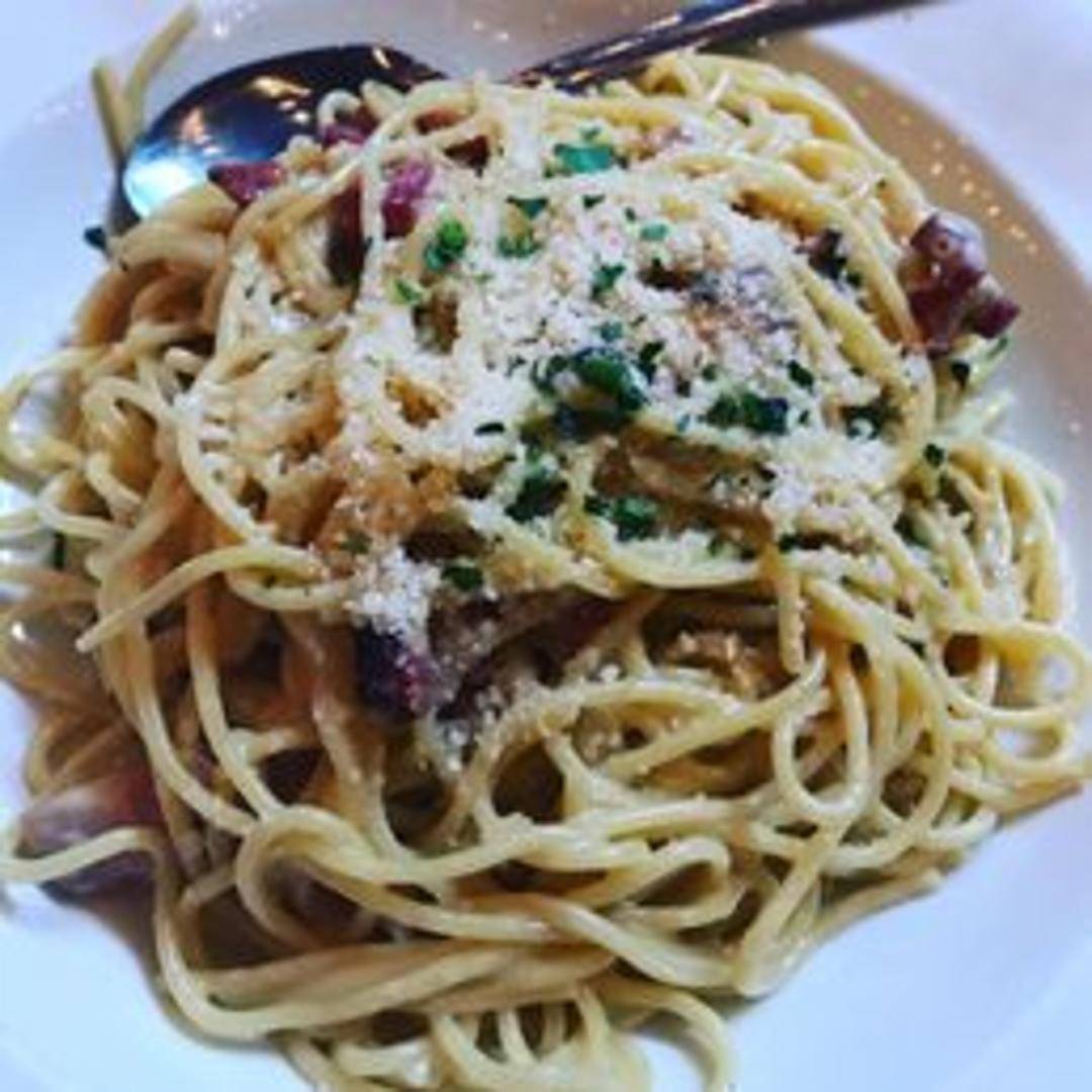 Spaghetti pasta tossed in a rich sauce made with eggs, pancetta, Parmesan cheese, and black pepper.
