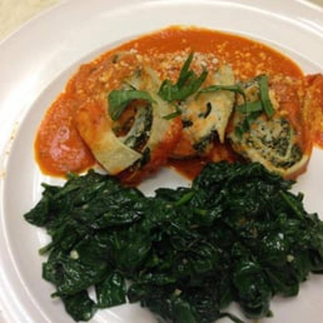 A rolled pasta dish filled with [Specific filling details, e.g., ricotta cheese, spinach, and herbs] served with [Specific sauce description, e.g., a creamy tomato sauce].