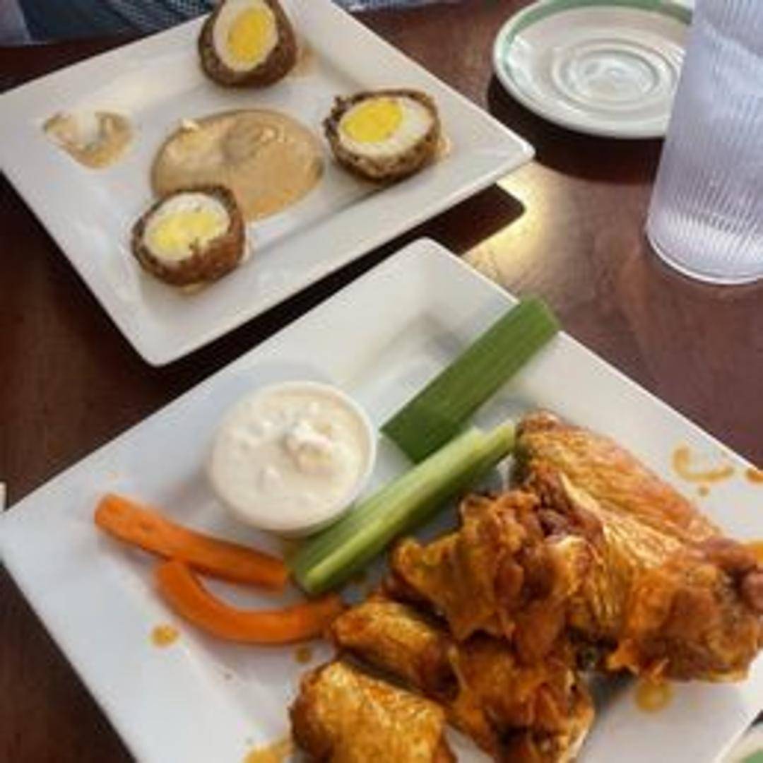 Hard-boiled eggs wrapped in seasoned sausage, breaded and deep-fried to a golden brown. Served with a dipping sauce.