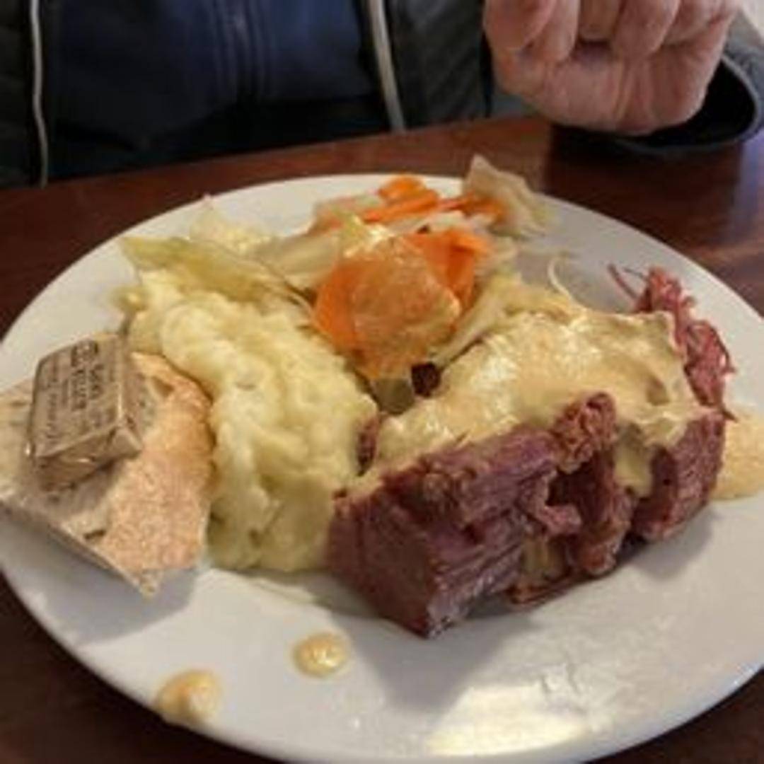 Tender slices of corned beef served with boiled cabbage, potatoes, and carrots.