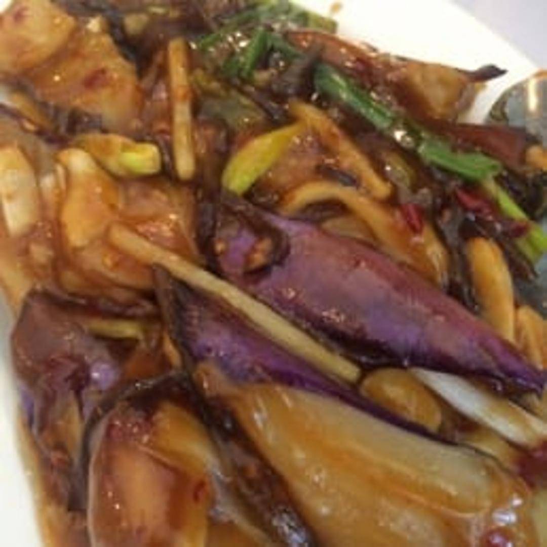Soft eggplant stir-fried with a rich garlic sauce, often featuring ginger and other aromatic ingredients. Typically served with a slightly sweet and savory flavor profile.