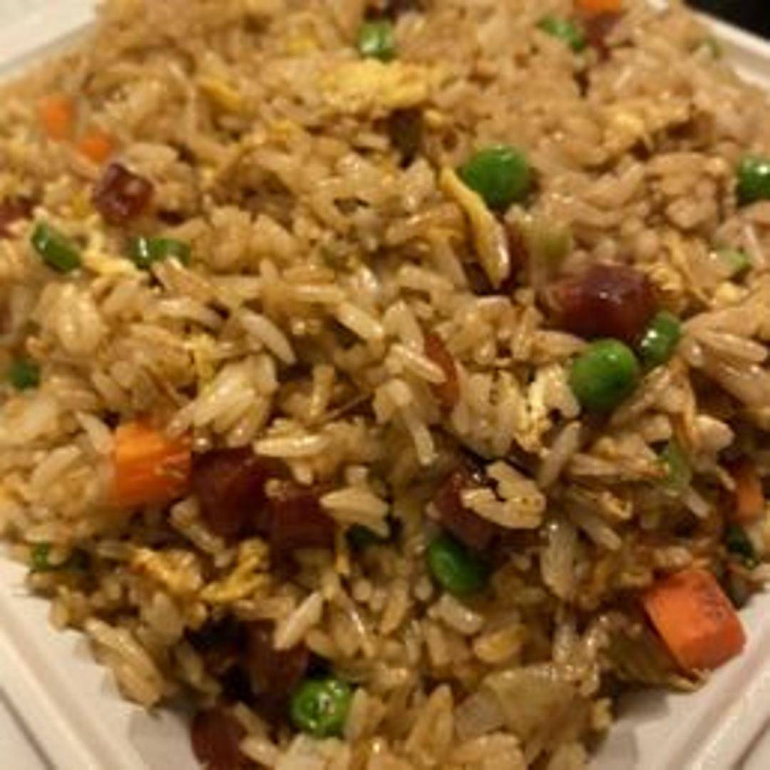 Classic fried rice featuring diced Chinese sausage, eggs, peas, carrots, and scallions. Wok-tossed with rice and seasonings for a savory and slightly sweet flavor, enhanced by the distinct taste of the sausage.