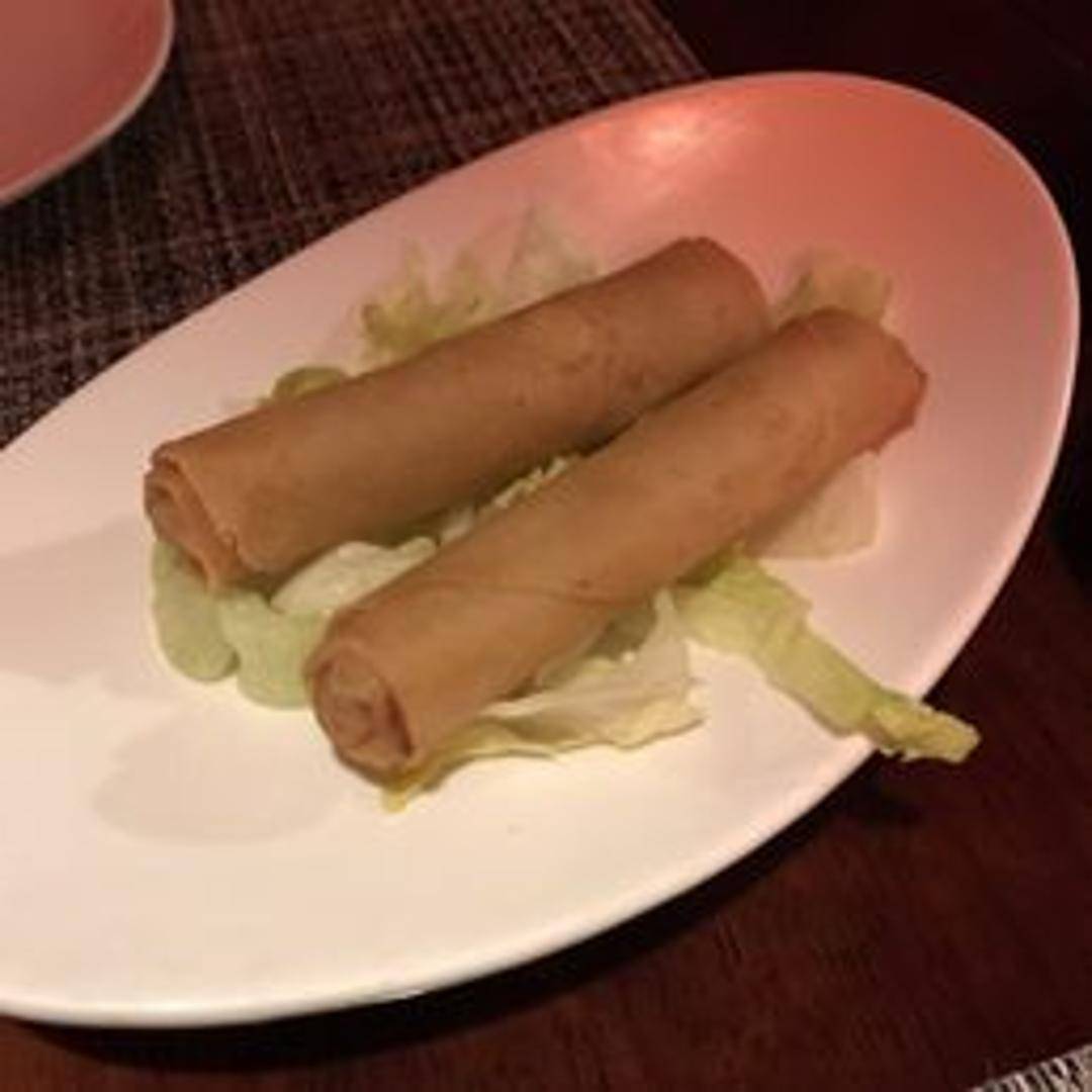 Enjoy a crispy and golden-fried appetizer featuring delicate wrappers generously filled with a flavorful mixture of shredded cabbage, carrots, and glass noodles. Served piping hot, these traditional rolls are perfect for dipping in a sweet and sour sauce, offering a satisfying crunch with every bite.