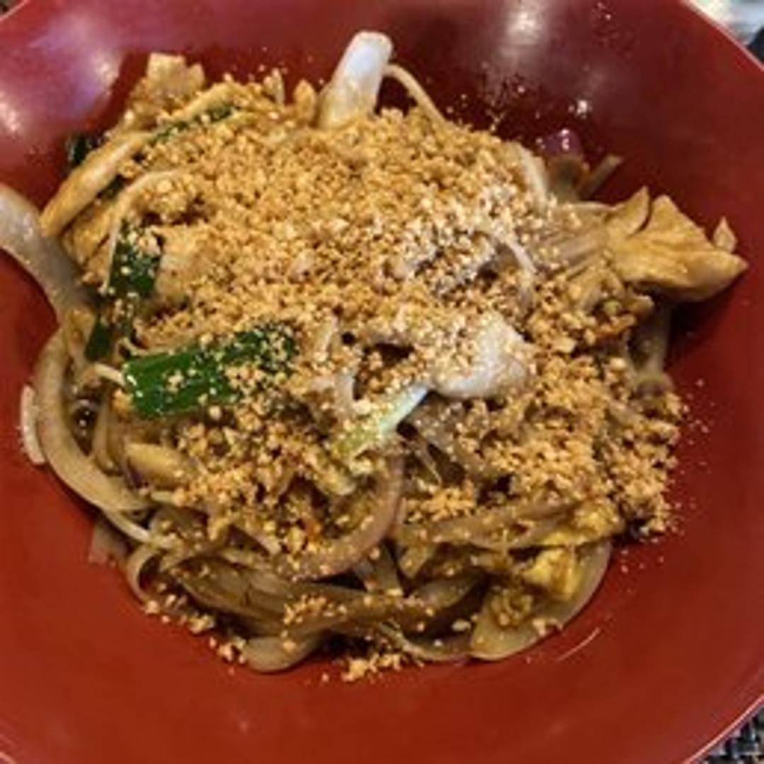 A popular Thai stir-fried noodle dish showcasing flat rice noodles wok-tossed with your choice of protein (typically chicken, shrimp, or tofu), scrambled egg, crisp bean sprouts, and green onions. Finished with a tangy, sweet, and savory tamarind-based sauce, and garnished with crushed peanuts and a fresh lime wedge for a balanced, vibrant flavor.