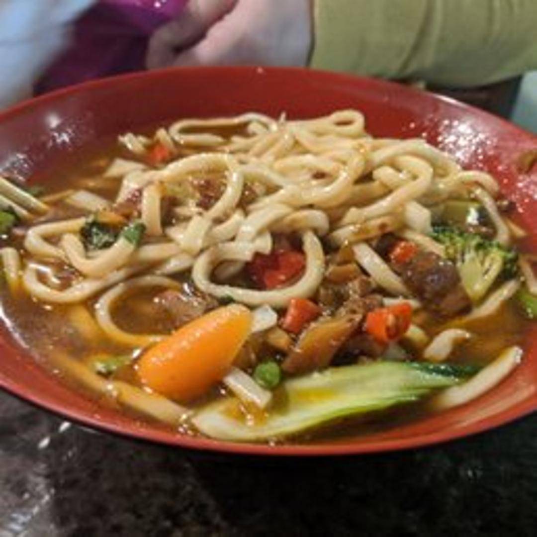 A robust and intensely flavorful noodle dish featuring tender pieces of chicken, tossed with fresh, al dente noodles in a rich, savory, and spicy sauce. This hearty bowl offers a delightful warmth and a satisfying spice level.