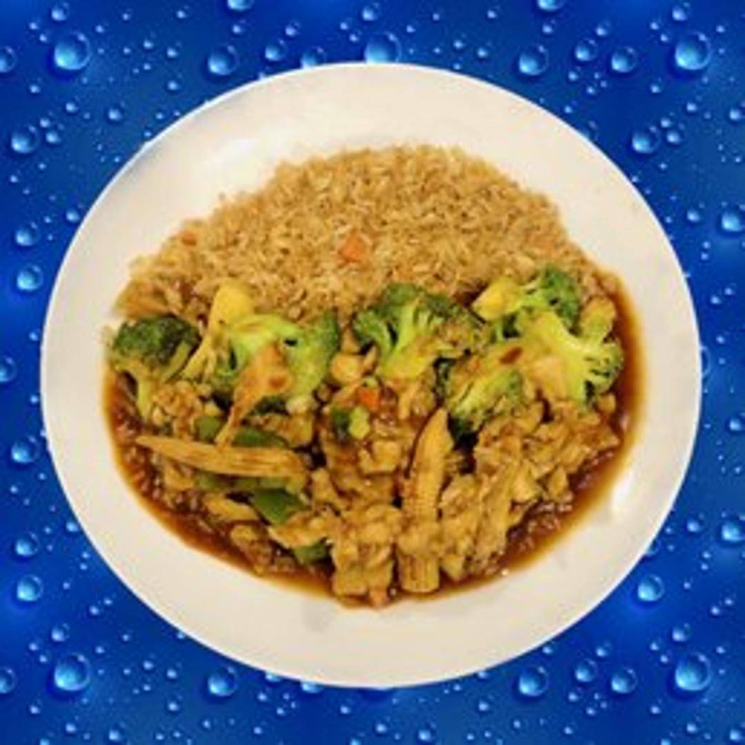 Savor the fiery and complex flavors of our Hunan Chicken, a classic dish showcasing tender pieces of chicken stir-fried with an array of crisp vegetables, including bell peppers and bamboo shoots, all bathed in a robust and spicy sauce infused with chili and garlic. A bold choice for those who appreciate a kick.