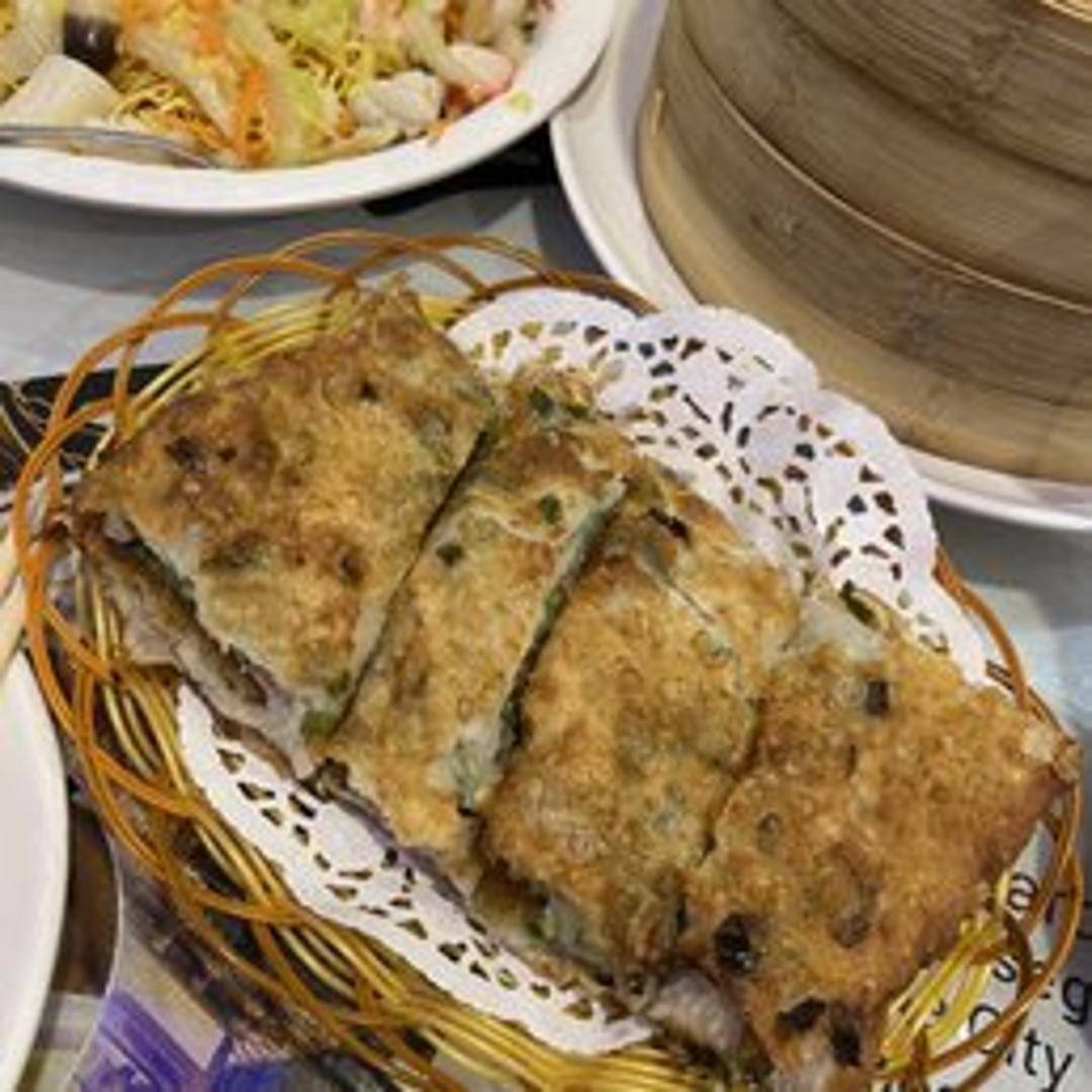 Crispy and flaky scallion pancake filled with thinly sliced, seasoned beef. A savory and satisfying breakfast option.