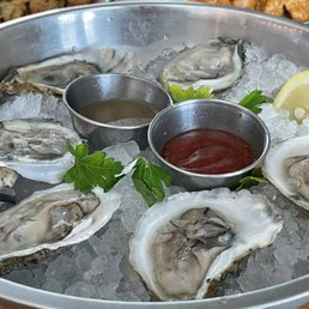 Freshly shucked, raw oysters served chilled on a bed of ice with lemon wedges and cocktail sauce. A taste of the ocean, perfect for purists and oyster aficionados.