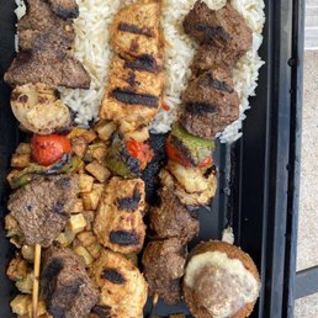 A flavorful combination plate featuring both chicken and lamb kabobs, served with rice, a side salad, hummus, and pita bread.