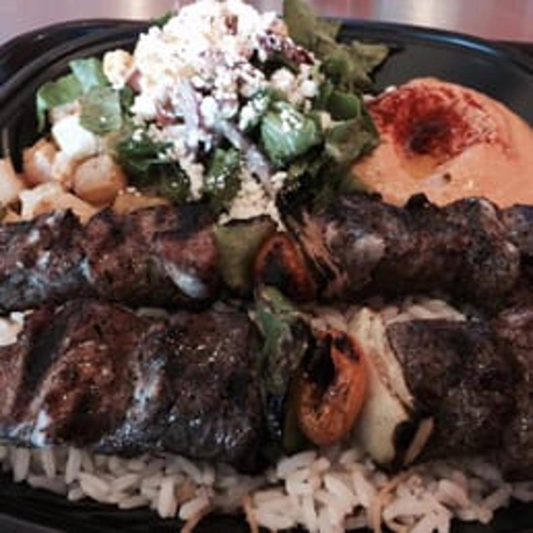 Grilled lamb kabobs, marinated in special spices, served with rice, a side salad, hummus, and pita bread.