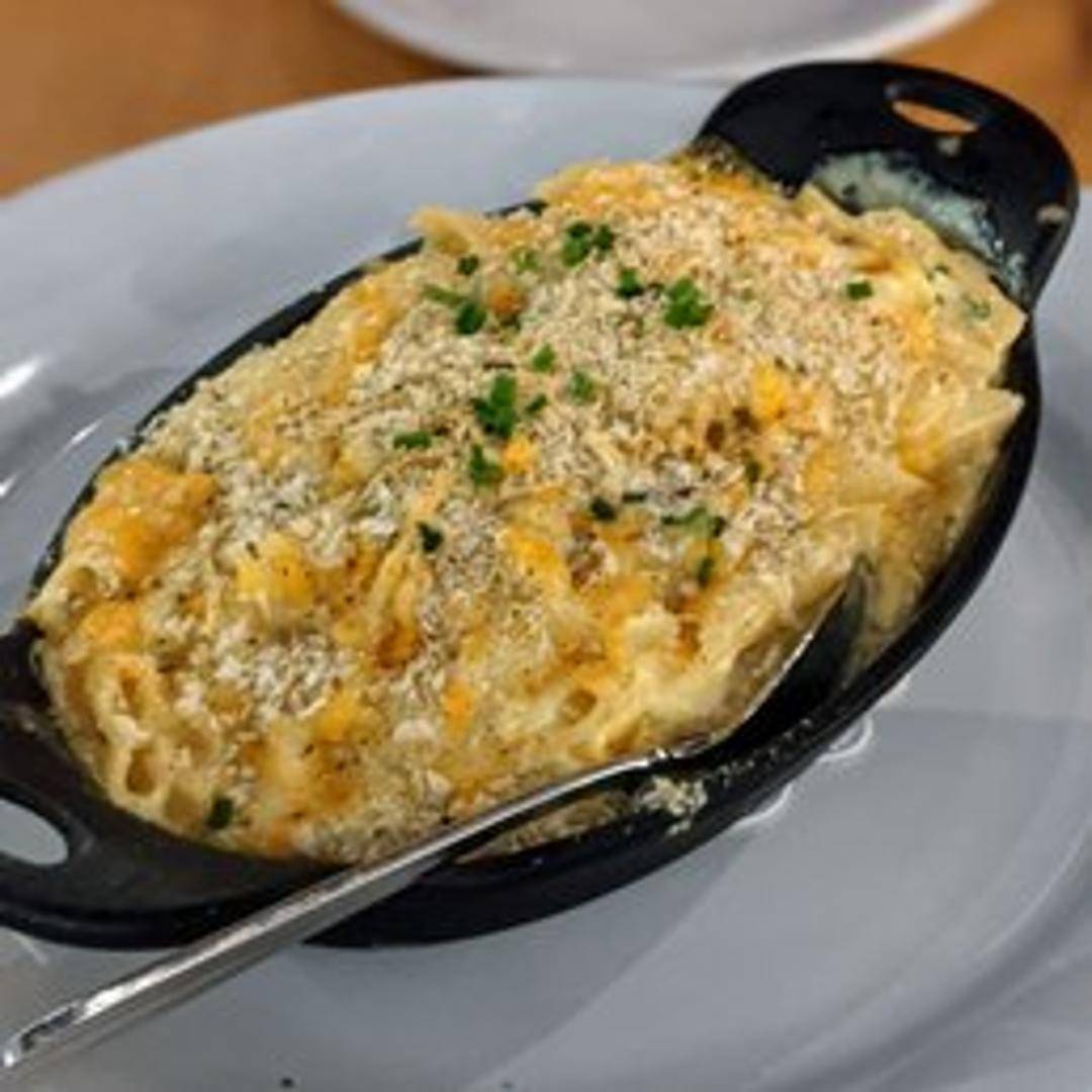 Cavatappi pasta in a creamy cheese sauce infused with truffle oil, topped with toasted breadcrumbs.