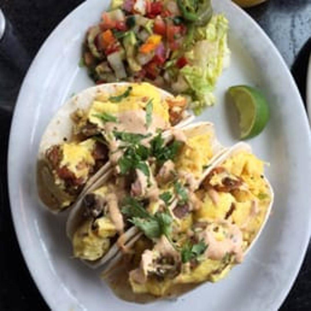 Scrambled eggs, cheese, and your choice of bacon, sausage, or chorizo in warm flour tortillas. Served with salsa.