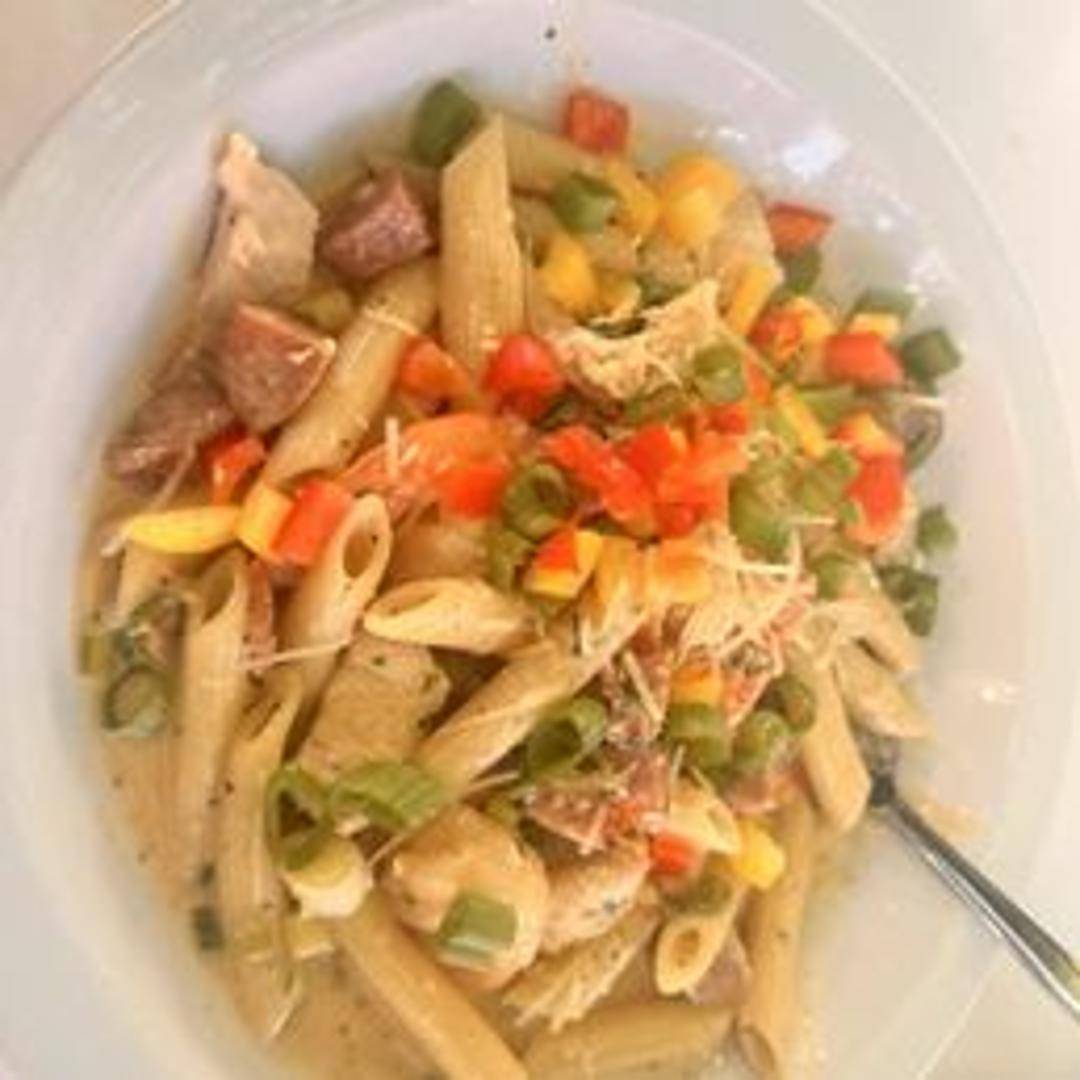 Pasta tossed with shrimp, crab, and a creamy seafood sauce.