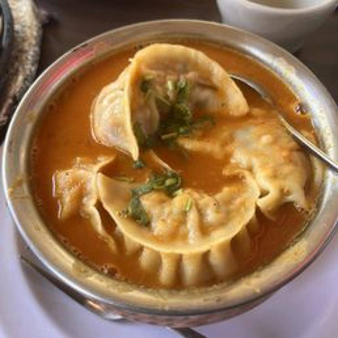 Steamed dumplings (momo) served in a flavorful, tangy, and slightly spicy tomato-based soup (jhol). The momos are typically filled with seasoned meat or vegetables.