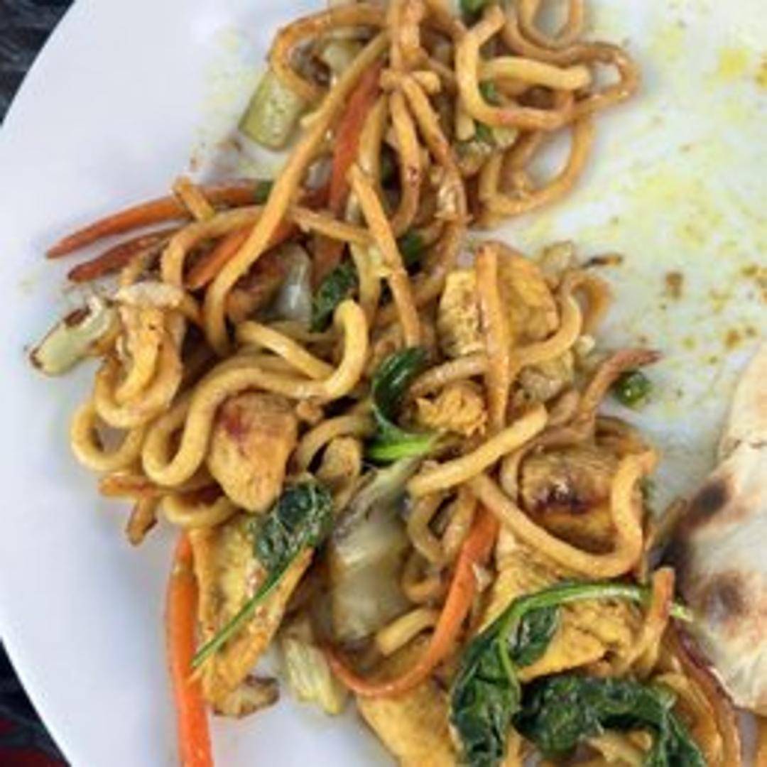 Hand-pulled Tibetan noodles stir-fried with vegetables and your choice of meat (chicken, beef, or vegetable) in a savory sauce.