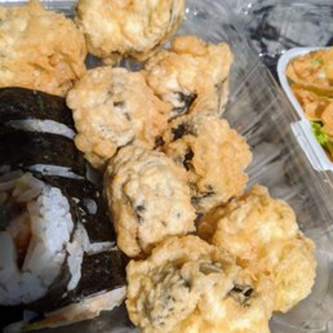 A sushi roll featuring smoked salmon, cream cheese, and avocado, often with sesame seeds on the outside.