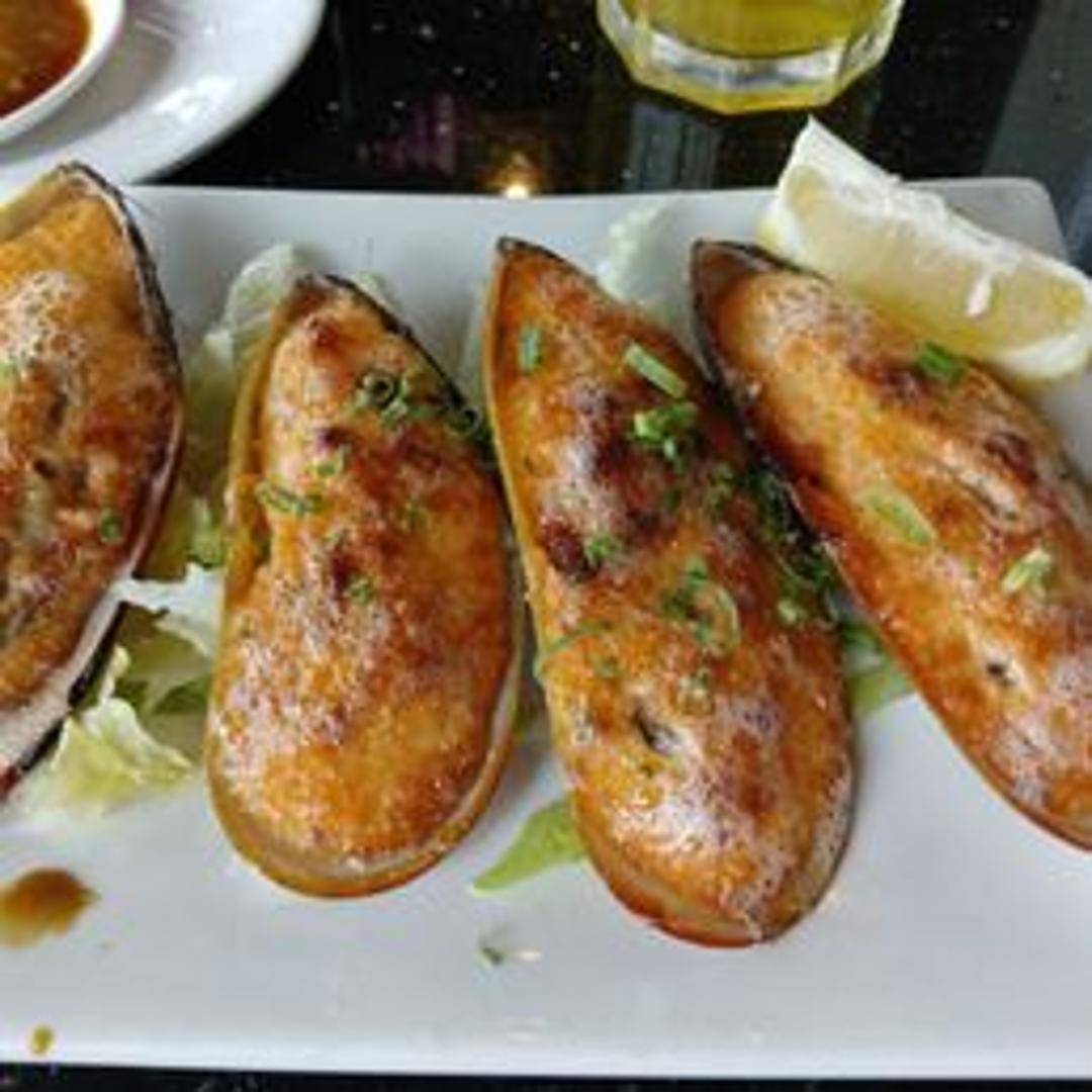 Four baked or grilled mussels, often topped with a creamy, flavorful sauce and breadcrumbs, creating a golden crust.