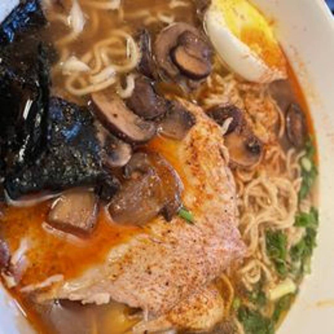 A flavorful and comforting ramen bowl featuring a rich broth, noodles, protein (typically pork or chicken), soft-boiled egg, and various toppings such as scallions, nori, and seasoned bamboo shoots.