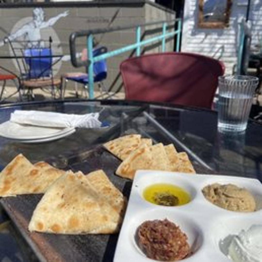 A vibrant Mediterranean platter with hummus, baba ghanoush, olives, feta cheese, cucumbers, tomatoes, and warm pita bread.
