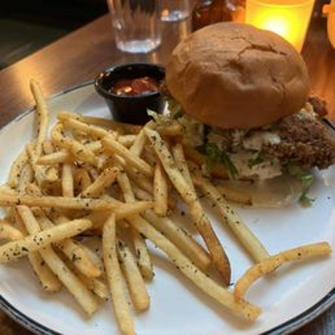 Crispy, golden-brown fried chicken breast served on a toasted bun with your choice of toppings and sauces. A satisfying and flavorful sandwich.