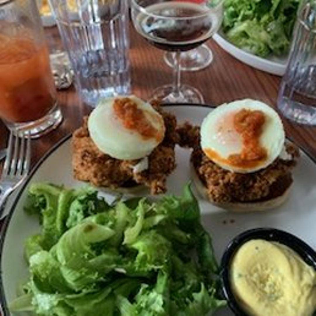Crispy fried chicken served atop a toasted English muffin, poached eggs, and hollandaise sauce. A savory and indulgent twist on a classic breakfast dish.