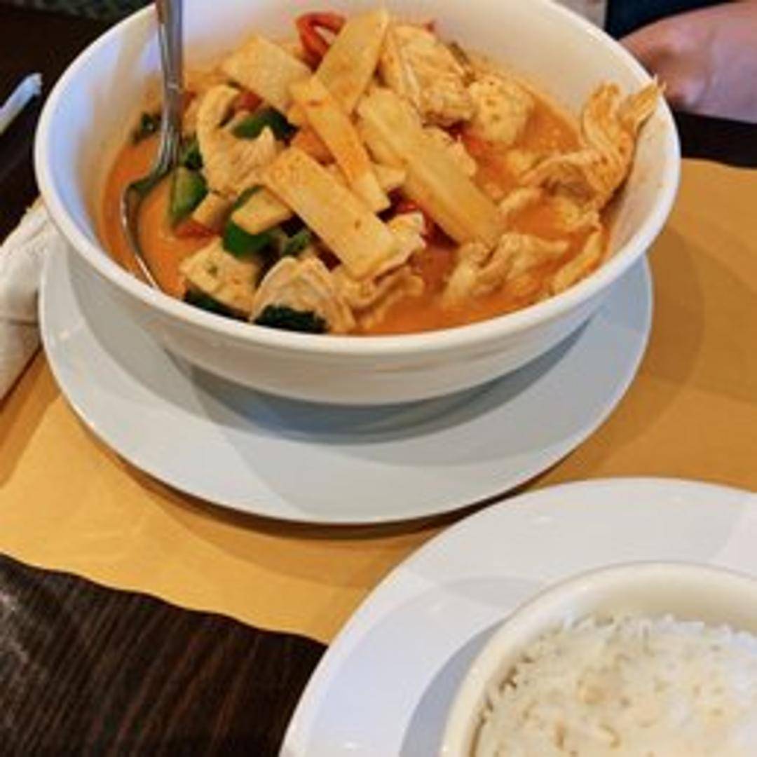 A robust and moderately spicy Thai Red Curry (Gaeng Phet), prepared with a vibrant red chili paste, simmered to perfection in creamy coconut milk. This classic dish is infused with aromatic herbs and spices, typically featuring bamboo shoots, bell peppers, and fresh basil leaves, offering a rich and well-balanced flavor that is both comforting and exhilarating.