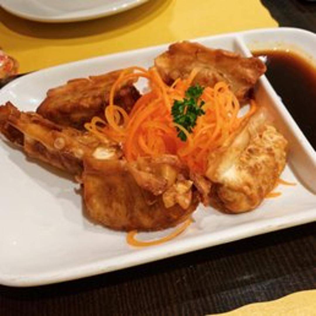 Delicately crafted dumplings, a perfect start to your meal. These tender parcels are typically filled with a savory mixture of seasoned ground chicken and shrimp, either steamed to a succulent perfection or lightly pan-fried for a crispy exterior. Served with a traditional soy-based dipping sauce, they offer a delightful burst of flavor in every bite.