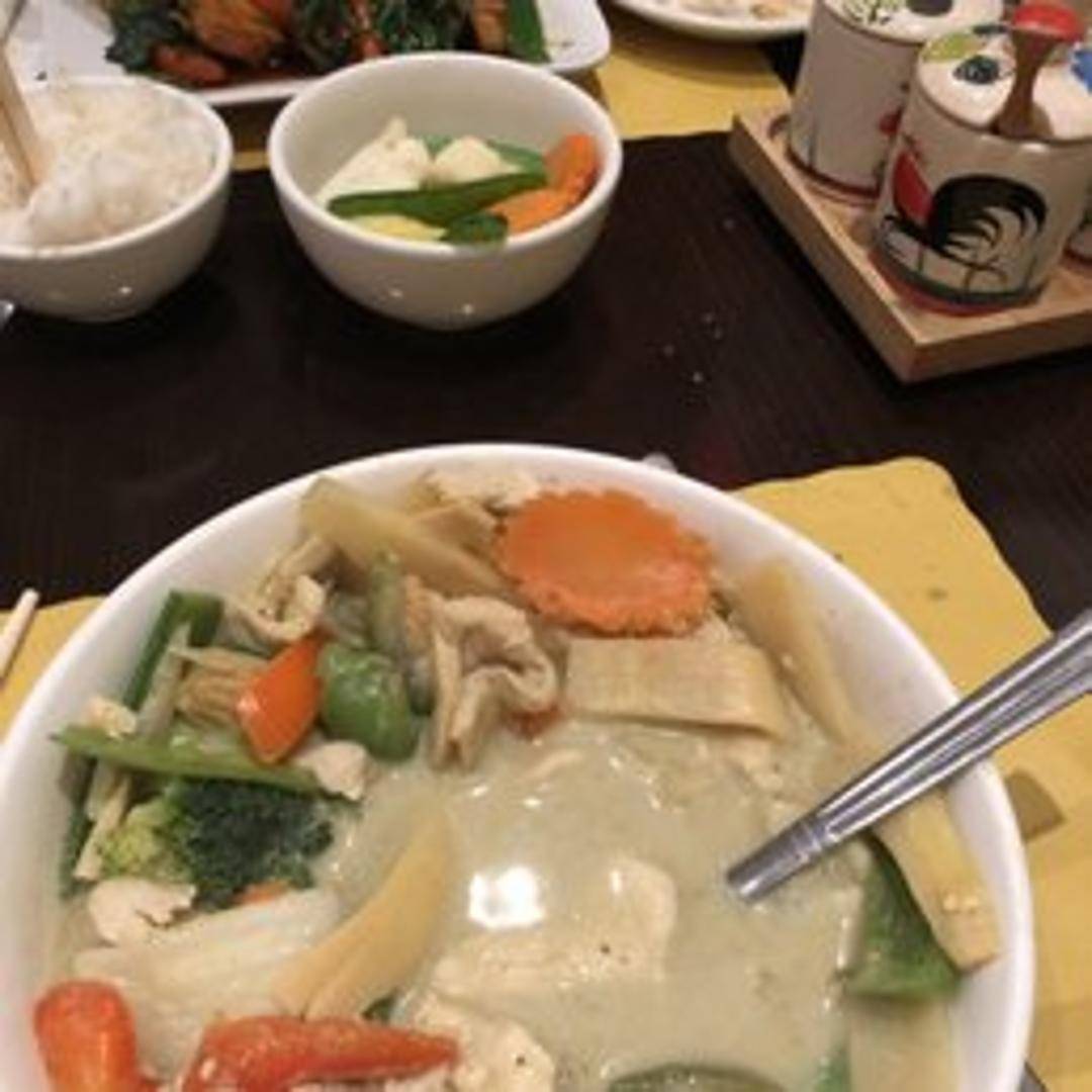 A vibrant and aromatic Thai Green Curry (Gaeng Keow Wan), rich with the creamy texture of coconut milk. This beloved curry features a distinctive green chili paste base, simmered with bamboo shoots, tender eggplant, bell peppers, and fragrant basil leaves, offering a perfect balance of sweet, spicy, and savory notes.