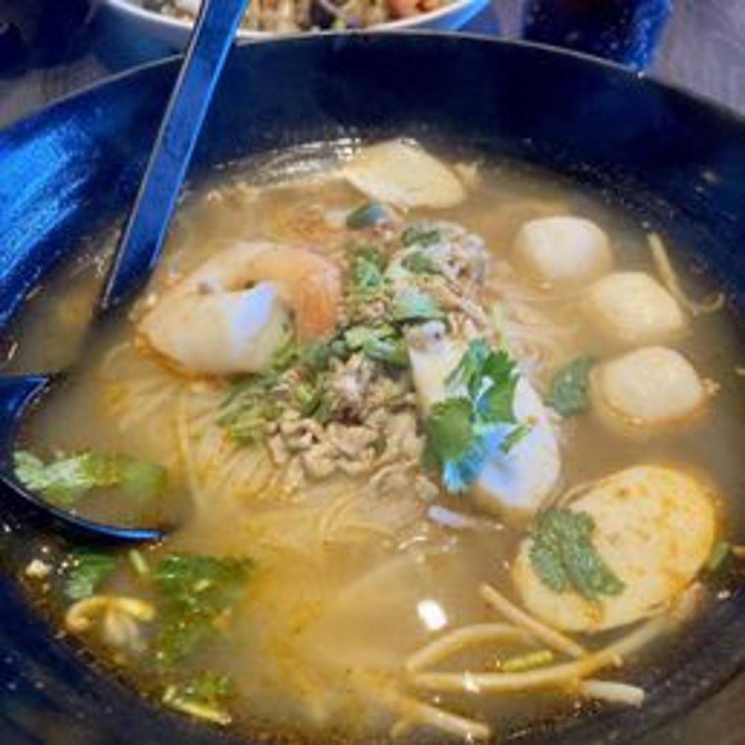 A spicy and sour noodle soup with lemongrass, galangal, kaffir lime leaves, chili peppers, and mushrooms. Served with your choice of protein and rice noodles.
